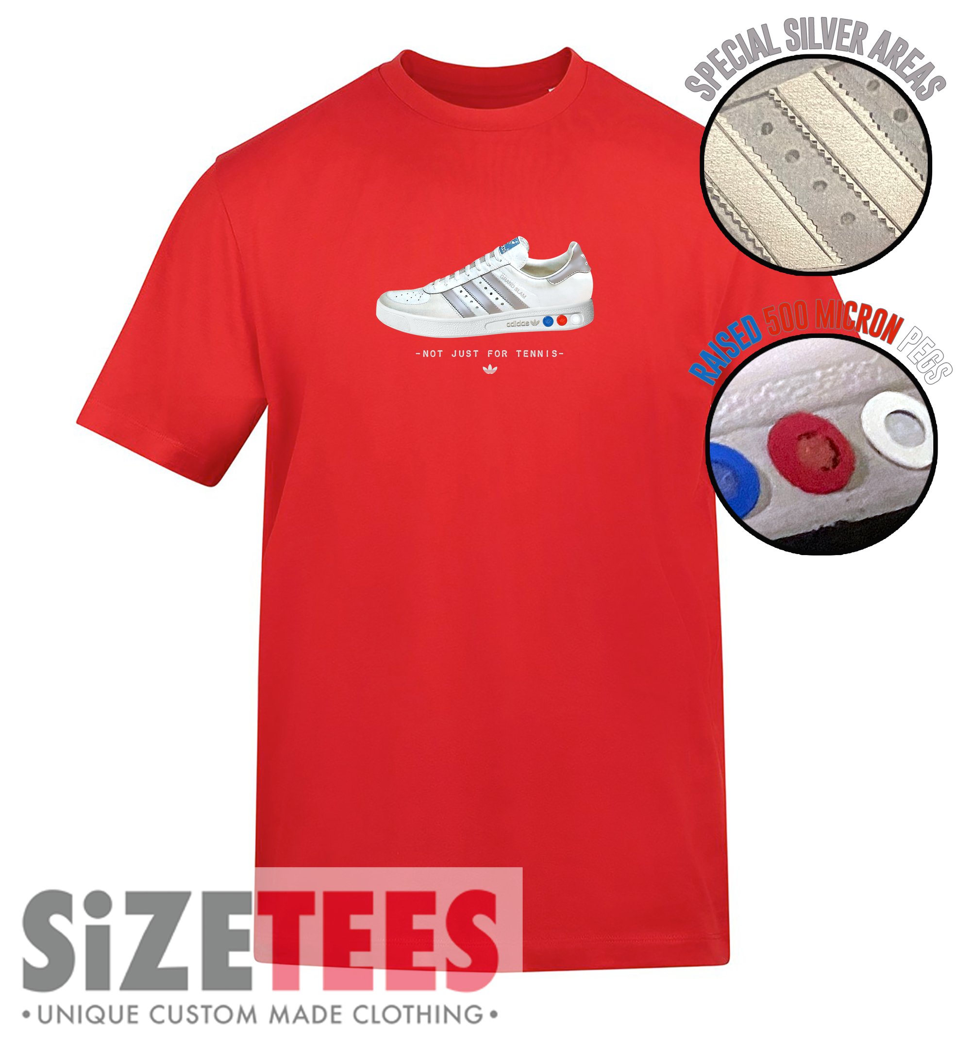 Grand Slam Trainers custom made design incorporating with the trainer image is silver metallic areas plus 500 micron red white and blue plugs. (see detailed image of product.) Each item is custom made according to design and size. All garments are created using professional materials to produce a long, durable finish, using the latest equipment. *Please contact us for availabilty of other sizes. *Any further requests please contact us. 100 % cotton Gentle wash cycle (inside out) No fabric softeners Hang dry Iron on reverse No Returns. Any order declared faulty will be inspected and discussed with buyer. Photographs of items are taken before shipping. UK SIZE GUIDE: S 34/36" M 38/40" L 42/44" XL 46/48" 2XL 50/52"
