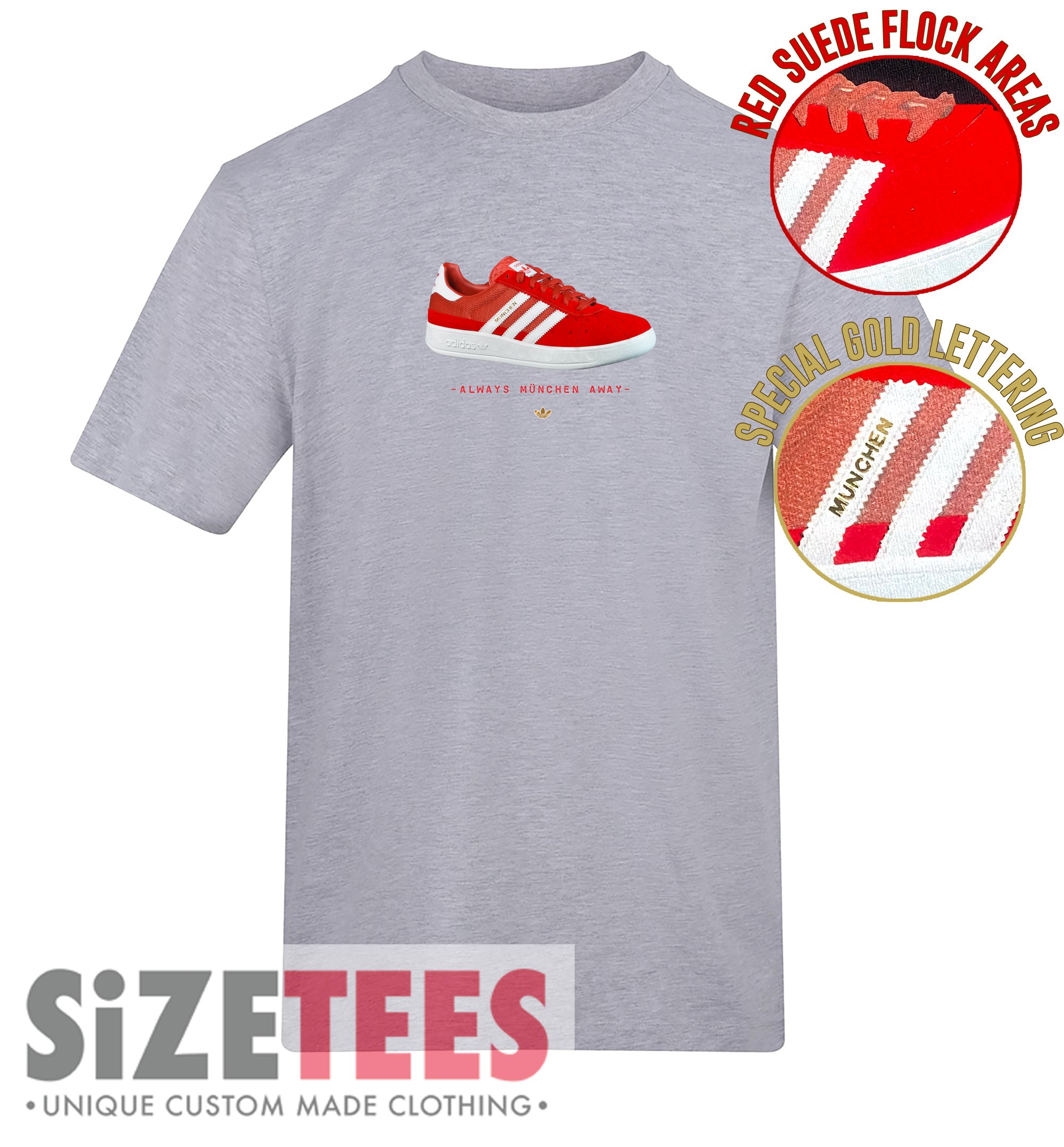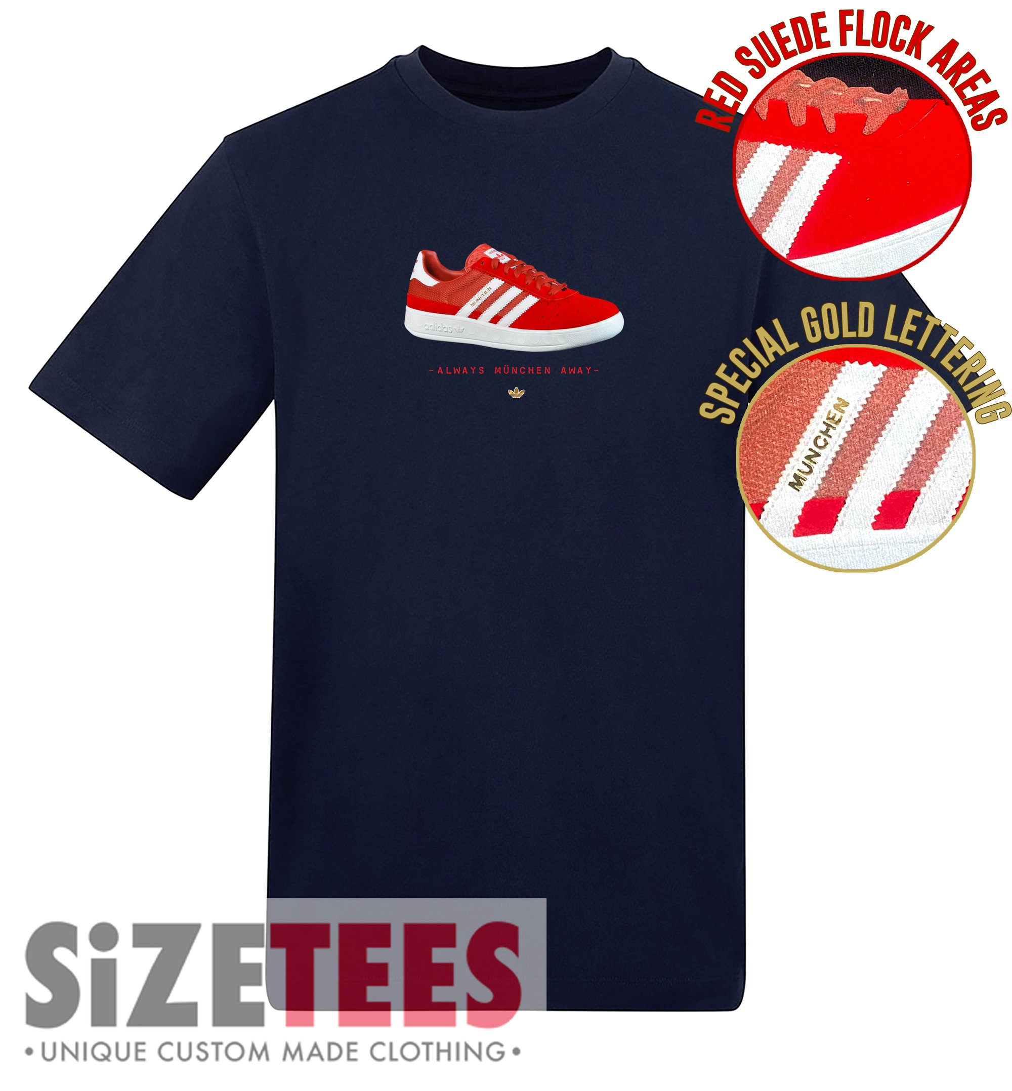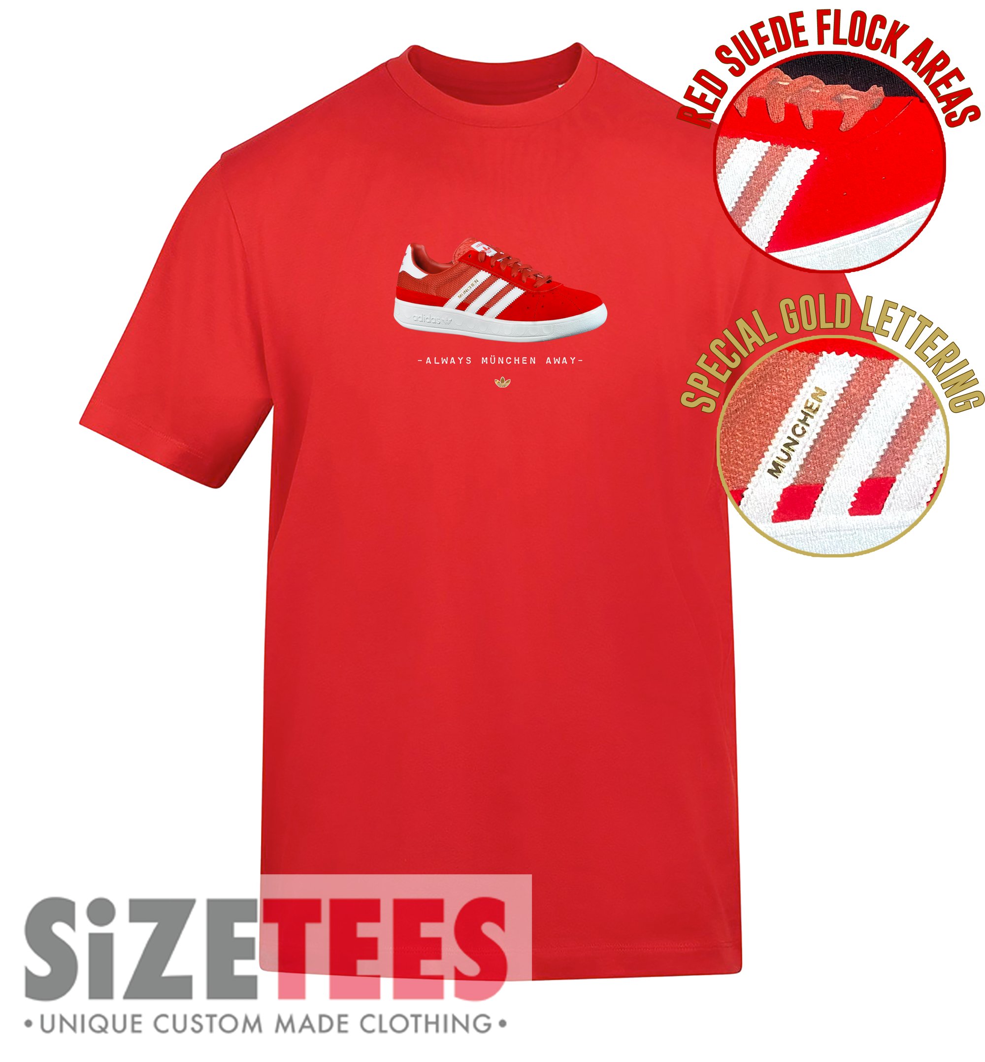 Classic Red Munchen trainers custom made design - the trainer image includes Special Red Flock areas and gold lettering. (see detailed image of product.) Each item is custom made according to design and size. All garments are created using professional materials to produce a long, durable finish, using the latest equipment. *Please contact us for availabilty of other sizes. *Any further requests please contact us. 100 % cotton Gentle wash cycle (inside out) No fabric softeners Hang dry Iron on reverse No Returns. Any order declared faulty will be inspected and discussed with buyer. Photographs of items are taken before shipping. UK SIZE GUIDE: S 34/36" M 38/40" L 42/44" XL 46/48" 2XL 50/52"